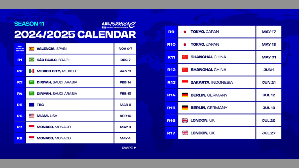 يُذكر أن الموسم سيبدأ في ساو باولو في 7 ديسمبر 2024، بعد اختبارات ما قبل الموسم التي ستجرى بين 4 و7 نوفمبر 2024 في فالنسيا. سيشهد هذا الموسم ولأول مرة 11 موقع مميز، بما في ذلك مواقع جديدة مثل ميامي وجدة. كما ستشهد موناكو لأول مرة سباقين منفصلين، بينما تستضيف طوكيو مثلهما في 17 و18 مايو، إلى جانب مواقع أخرى مثل جاكرتا.