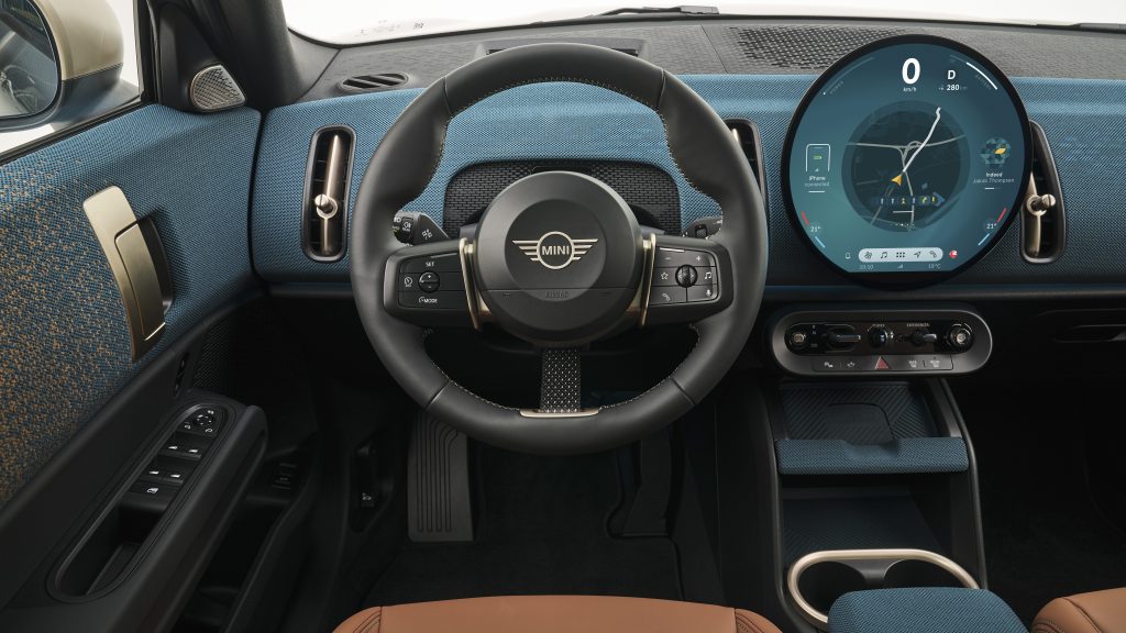 في الداخل، تم تغطية لوحة القيادة وألواح الأبواب ذات التصميم الواضح بأسطح نسيجية. ويُعمل على تنسيق تصميمها مع ثمانية أوضاع مختلفة لتجربة ميني: تُتيح هذه الأوضاع زيادة خيارات تخصيص المقصورة الداخلية عن طريق إسقاط الضوء وواجهة مستخدم قابلة للتخصيص وأصوات محرك جديدة. من ناحية أخرى، يعمل نظام التشغيل MINI 9، الذي جرى تحسينه للتحكم به باللمس والتحكم الصوتي، إلى جانب شاشة OLED المركزية التي يبلغ قطرها 240 ملم والعديد من الوظائف الإضافية الرقمية الجديدة في مجموعة MINI Connected، على رفع مستوى متعة القيادة. ويتجلى ذلك أيضاً في المقود متعددة الوظائف المصمم حديثاً القادم بتصميمٍ ثنائي الأضلاع وحزام قماشي اختياري.