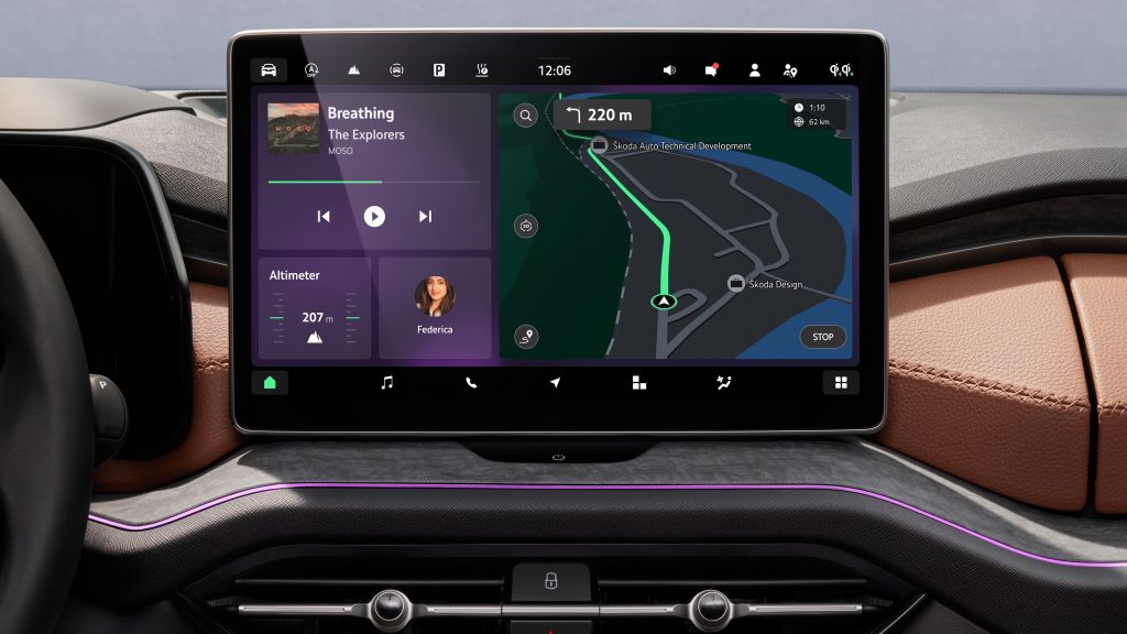 وكلمسةٍ خاصة من سكودا لإضفاء الأجواء المناسبة للعائلة، زوّدت المركبة بأربعة منافذ USB-C بقوة 45 واط، ومنفذ USB-C آخر بقوة 15 واط في مرآة الرؤية الخلفية. بالإضافة إلى 9 مكبرات صوت، مع نظام صوت كانتون بـ 14 مكبر صوت اختيارياً، وخاصية التدليك للمقاعد الأمامية.