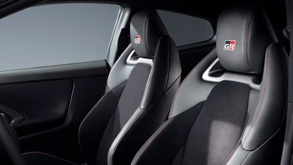 بينما تأتي المقصورة الداخلية بطابعٍ رياضي فريد يتوافق مع معايير مبدأ “السائق أولاً” التي تحدد هوية المركبة. قام فريق GR بالتعاون مع سائقي السباق والرالي بإعادة صياغة عناصر التحكم لإتاحة وصول أسرع وأكثر وضوحاً. تم تقريب أدوات التحكم الرئيسية وتحسين رؤية السائق، بالإضافة إلى توفير مساحة إضافية للراكب. تتضمن التجهيزات الإلكترونية شاشة وسطية للكونسول، وعدّاد رقمي بحجم 12.3 إنش مع وضعين للتخطيط، عادي ورياضي. يوفّر الأخير عرضاً للبيانات يركّز على الأداء العالي.