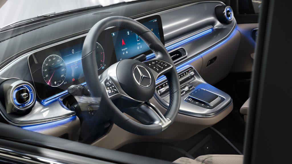 أما الآن، عليك فتح الباب والدخول إلى المقصورة المميّزة، لتستمتع بمكوّنات الرفاهية كافة، بما في ذلك النسخة المحدثة من النظام المعلوماتي الترفيهي MBUX في جميع الموديلات. وعند اختيارك لفئة Vito أو eVito ستحصل على عدادات ملوّنة مقاس 5.5 إنش وشاشة تعمل باللمس مقاس 10.25 إنش. في المقلب الآخر، تتميّز كل من V-Class و V-Class Marco Polo و EQV بزوجٍ من الشاشات مقاس 12.3 إنش.