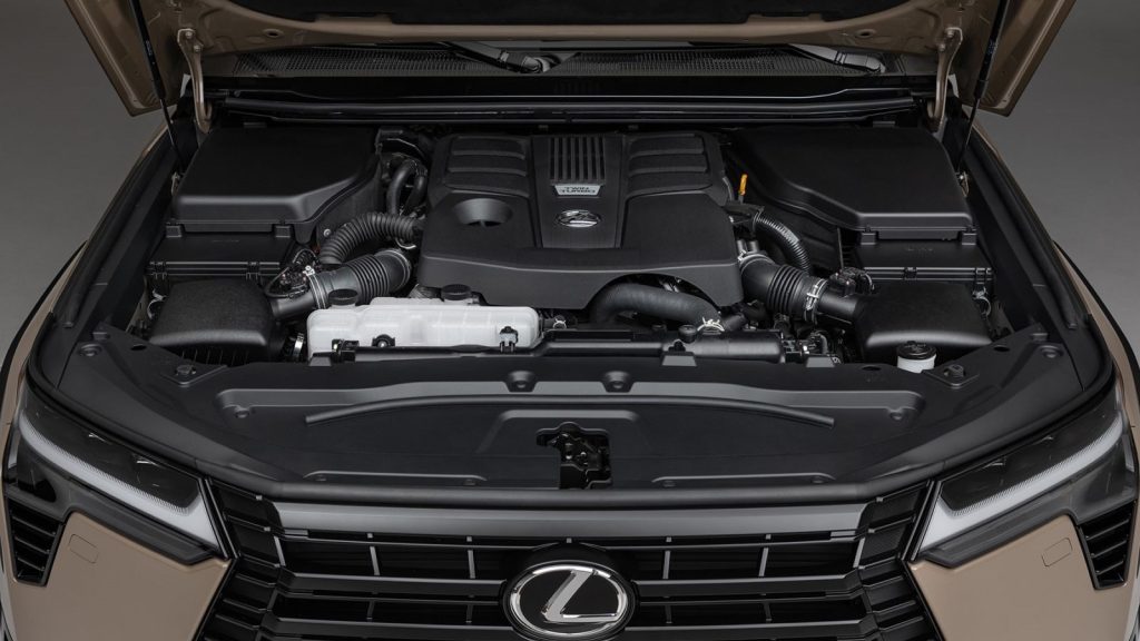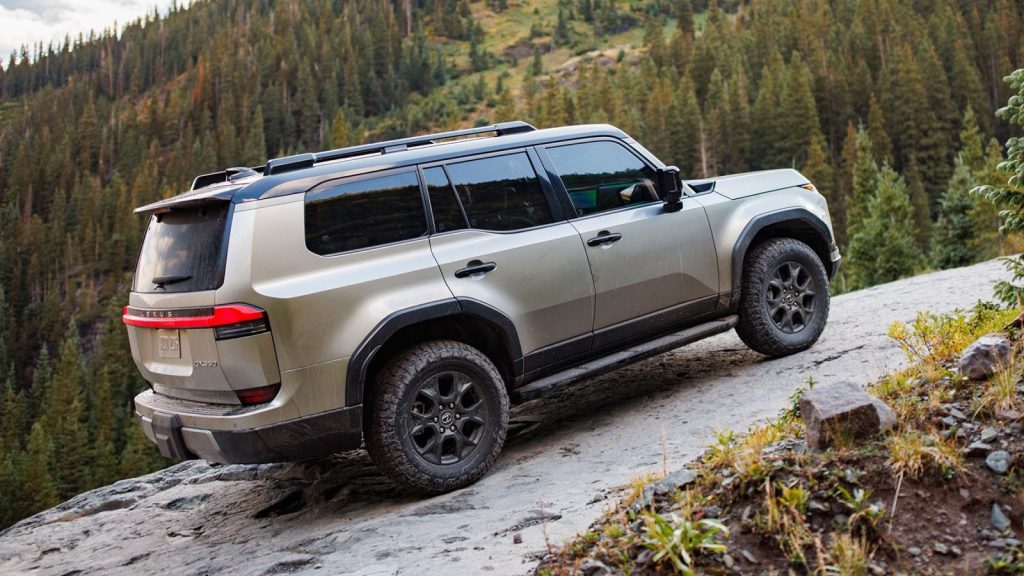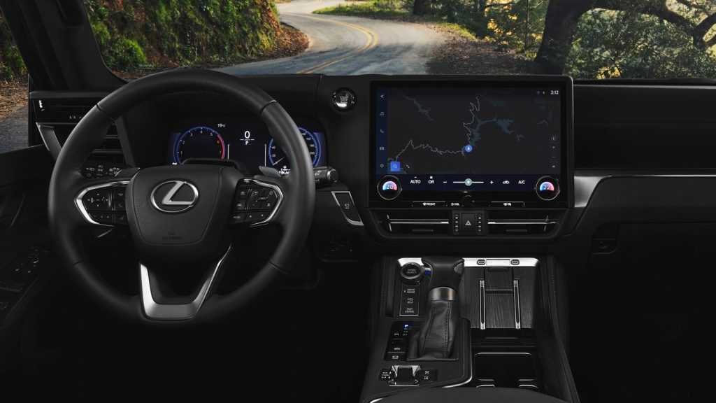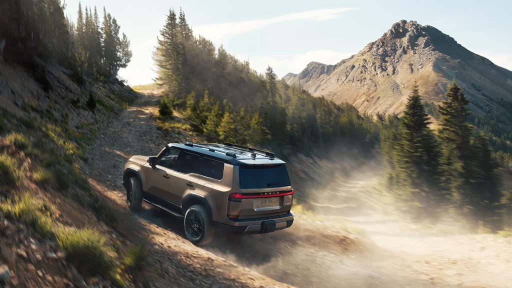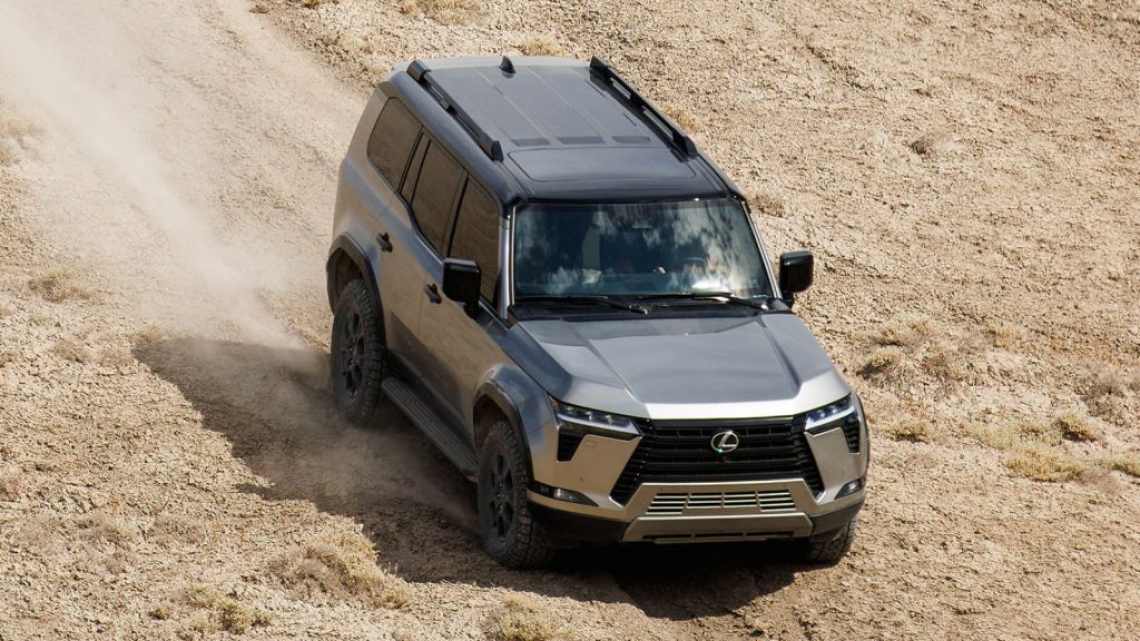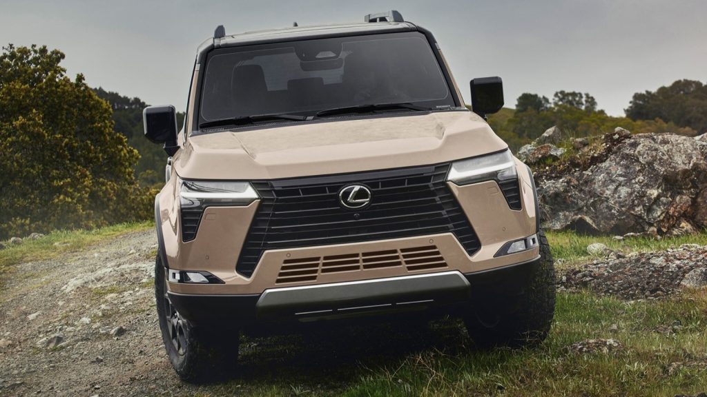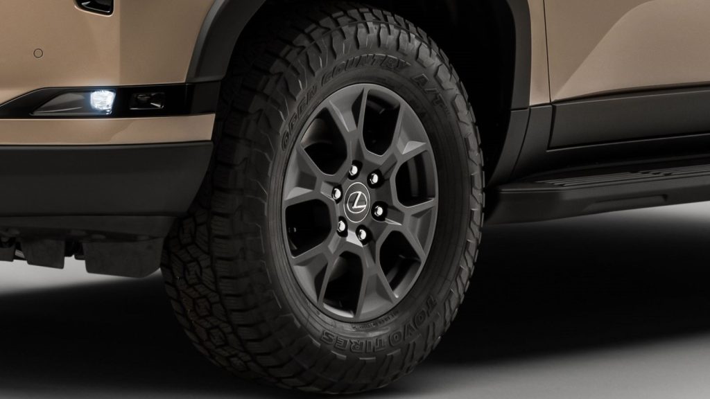 كما حصلت على شبك لكزس الاعتيادي ورف بسقف السيارة من الخارج باللون الأسود الذي سيطر على بعض اللمسات التعتيمية الأخرى في المرايا والحواف في التصميم الخارجي. هذا مع مصد أمامي جديد، وجنوط مقاس 18 إنش، مغطاة بإطارات 33 إنش. في حين، تأتي المصابيح الأمامية بنمط مُحدّث، وكذلك المصابيح الخلفية بشكل شريط LED واحد يصل بينها تحت شعار Lexus. تتماشى مجموعة الترقيات مع اللون الرملي الصحراوي القياسي للطلاء الخارجي، بالإضافة إلى خيارات عدة أخرى مثل الأبيض والرمادي..