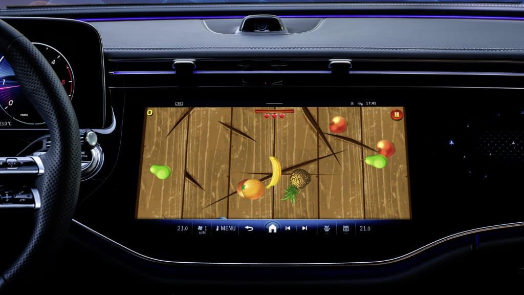 وبما أن مرسيدس تُدرك أن عالم القيمنق سيُسيطر على الأجيال الحالية والقادمة، ثبّتت تعاوناً مع خدمة بث الألعاب القديمة الأولى في العالم، Antstream Arcade، لدمج الألعاب السحابية في السيارة. بالإضافة إلى ذلك، تتمتع الشركة برؤيتها الخاصة للألعاب الغامرة داخل السيارة، والتي تُعرض في الفئة E الحالية. ليجمع عامل اللعب بين القوة الحاسوبية لنظام MBUX، جنباً إلى جنب مع أجهزة الاستشعار والمحركات الداخلية للمركبة.
