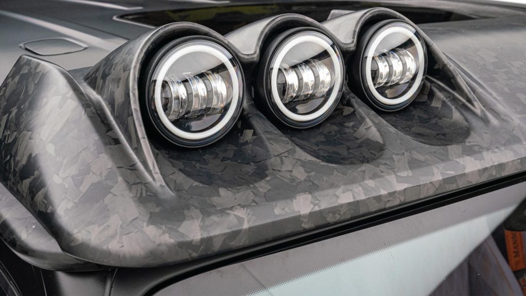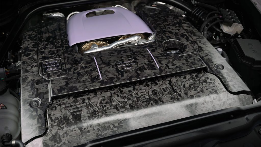 لننتقل إلى التفاصيل، وبدءاً من “Grand Entrée”، هناك مجموعة هيكل جديدة بالكامل تتضمن مصدات أمامية وخلفية محدثة، وحواف جانبية، مع أقواس عجلات، جميعها متصلة كقطعة واحدة كبيرة.. زد على ما ذُكر، مجموعة من الأضواء الساطعة في الأعلى، وجنوط قياس 24 إنش ذات 10 أذرع من طراز Pugnator، وجناح خلفي رياضي. وقد تم تزيينها بلونين يضمّان الفينيل المميز المكون من الكربون واللون الأسود.. لمسات منصوري الفائقة الاعتيادية..