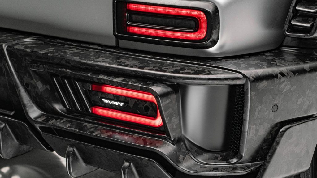 تتميز السيارة بتقنية الإغلاق التلقائي في مفصلات صندوق الأمتعة الخلفي، مما يسهل الدخول.. لتجد في الجزء الداخلي تصميم مخصص وفق تفضيلات العميل، حيث تأتي تحويلات منصوري عادةً كلوحة فارغة لتختار منها ما يناسبك. تشمل الخيارات هنا شعارات مطرزة، وعجلة قيادة رياضية من الجلد، وحصائر أرضية مبطنة، مع رقم الإصدار المنسوج على الكونسول الأوسط لإضافة لمسة خاصة.